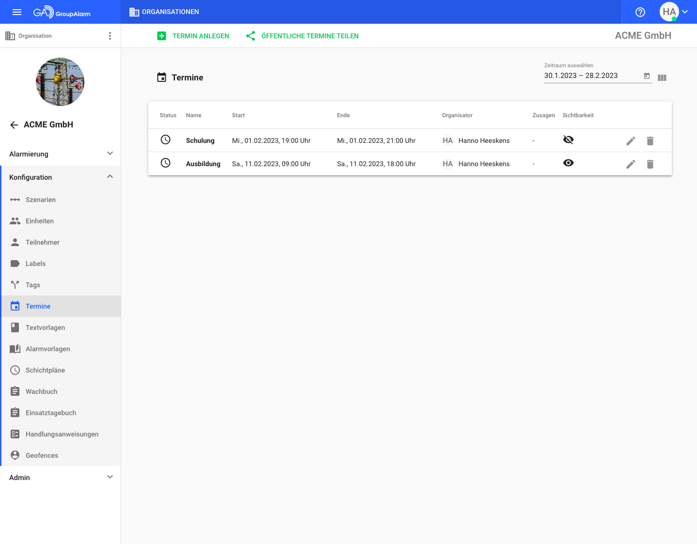 Um einen externen, öffentlichen Kalender Ihrer Organisation bereitzustellen, können Sie nun Termine als öffentlich markieren. Diese sind in einer iCal-Datei enthalten, die Sie z.B. mit Ihrer Webseite syncronisieren können. Auf diese Weise können Sie einfach und ohne zusätzlichen Aufwand einen öffentlichen Terminkalender über GroupAlarm pflegen. Rückmeldungen Ihrer Teilnehmer sind in der öffentlichen Ansicht nicht enthalten. Private Termine sind nicht in der öffentlichen Ansicht enthalten.