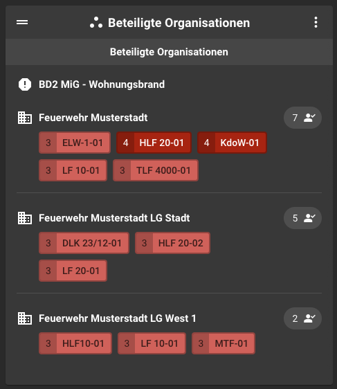 Wird ein Alarm in mehreren Organisationen mit der gleichen externen Ereignis-ID ausgelöst, kann das neue Panel im Alarmmonitor diesen zusammengehörenden Einsatz anzeigen. Jede Organisation sieht dazu im Panel die ebenfalls am Ereignis beteiligten Nachbarorganisationen, deren alarmierte Einheiten (inkl. Status) und die Anzahl der positiven Rückmeldungen auf den Alarm.