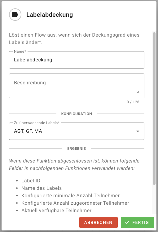 Bei jedem Aufruf eines Flows werden detaillierte Informationen übergeben, um eine präzise Reaktion zu ermöglichen. Dazu gehören neben dem Label-Namen und der ID auch die exakte Anzahl der zugewiesenen und aktuell aktiven Personen sowie der Deckungsgrad in Prozent und die absolute Reserve. Im Flow können weitere Maßnahmen konfiguriert werden, z. B. Alarme oder Benachrichtigungen per Messenger.