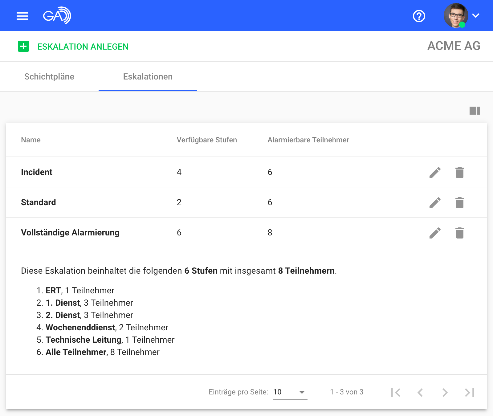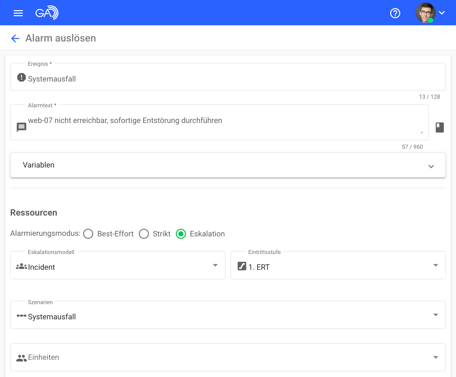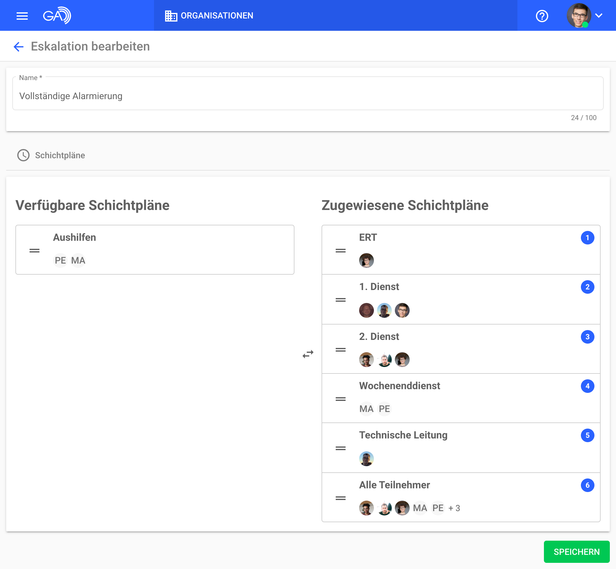 Legen Sie zunächst Schichtpläne mit den gewünschten Teilnehmern an und ziehen Sie diese anschließend in einem Eskalationsmodell in die passende Reihenfolge. Bei der Alarmauslösung können Sie dann den Eskalationsmodus mit dem jeweiligen Eskalationsmodell und der Einstiegsstufe auswählen.