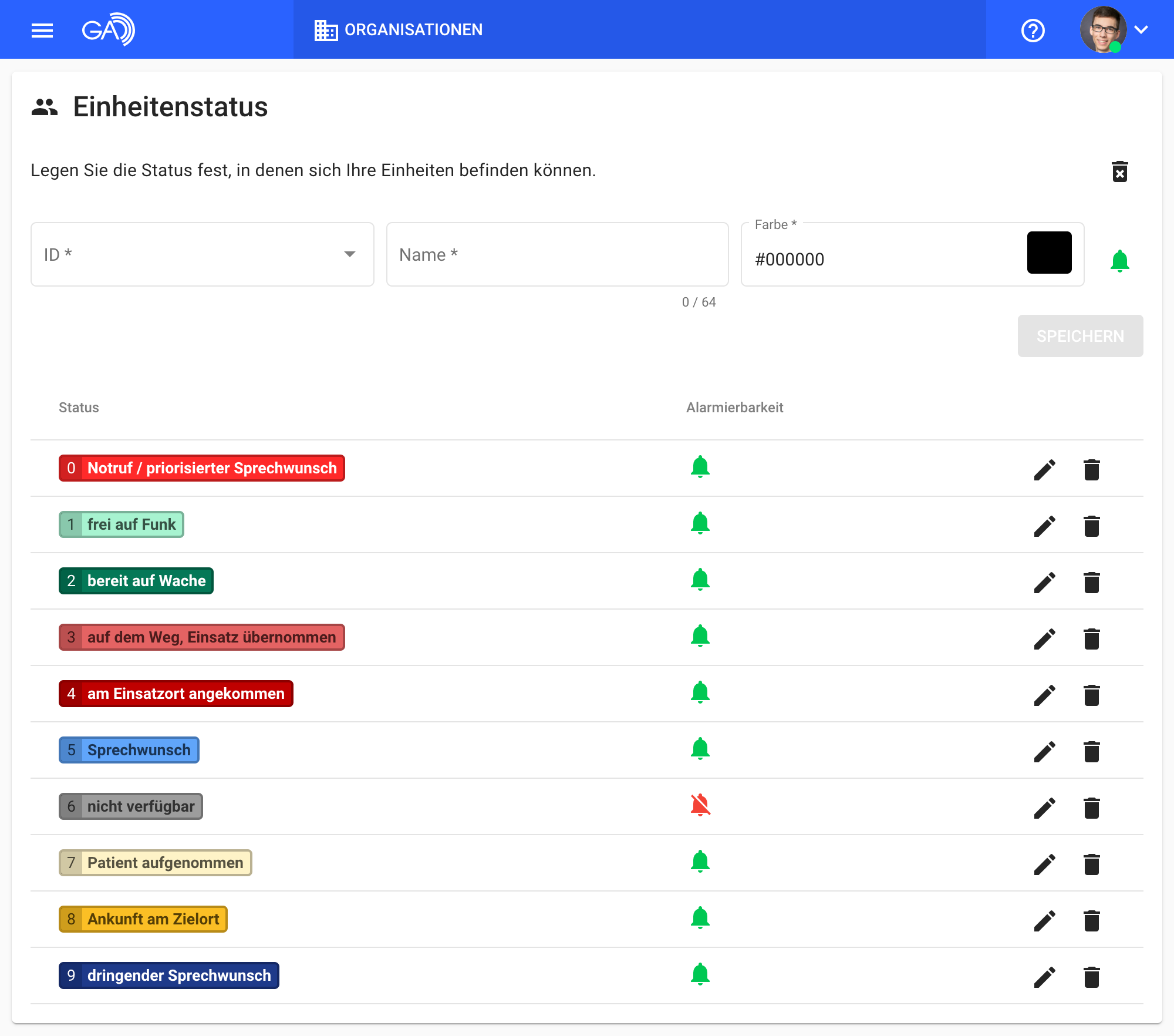 Wir liefern für Ihre Einheiten ein Standardset an Status mit. Passen diese nicht zu Ihren Bedürfnissen, können Sie in den Organisationseinstellungen bestehende Status löschen, anpassen oder neue anlegen. Auch das Zurücksetzen auf unsere Standard-Status ist dort möglich.