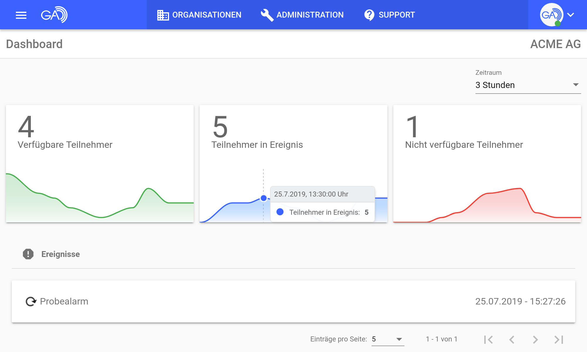 Im neuen Organisationsdashboard sehen Sie nun – entsprechende Daten vorausgesetzt – eine Übersicht über die Verfügbarkeit Ihrer Teilnehmer in einem wählbaren Zeitraum von fünf Minuten bis 24 Stunden. So erkennen Sie ganz einfach, zu welcher Uhrzeit wie viele Ihrer Kräfte verfügbar, in einem Ereignis oder nicht verfügbar sind.
