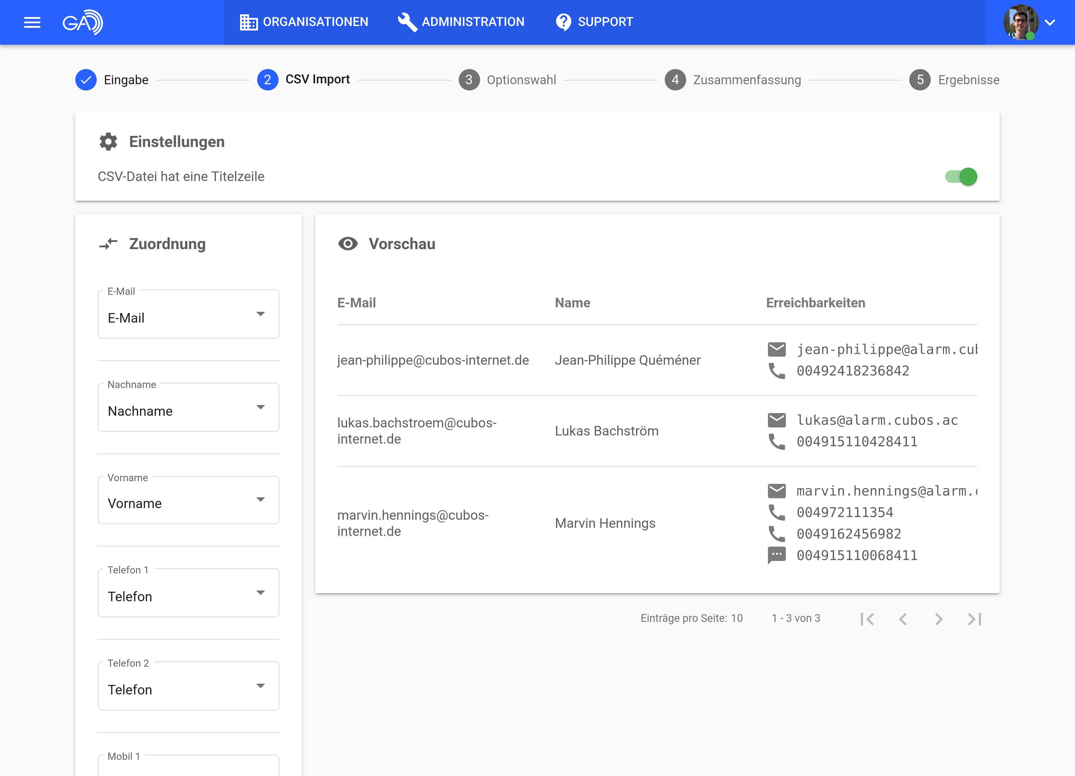 Neue Teilnehmer können in der neuen Version von GroupAlarm mithilfe einer CSV-Datei hinzugefügt werden. Zusätzlich zu den benötigten E-Mail Adressen der Teilnehmer können Sie die einzelnen Erreichbarkeiten in den Spalten der CSV-Datei angeben. Diese werden im Import-Prozess automatisch angelegt und für den Teilnehmer aktiviert.