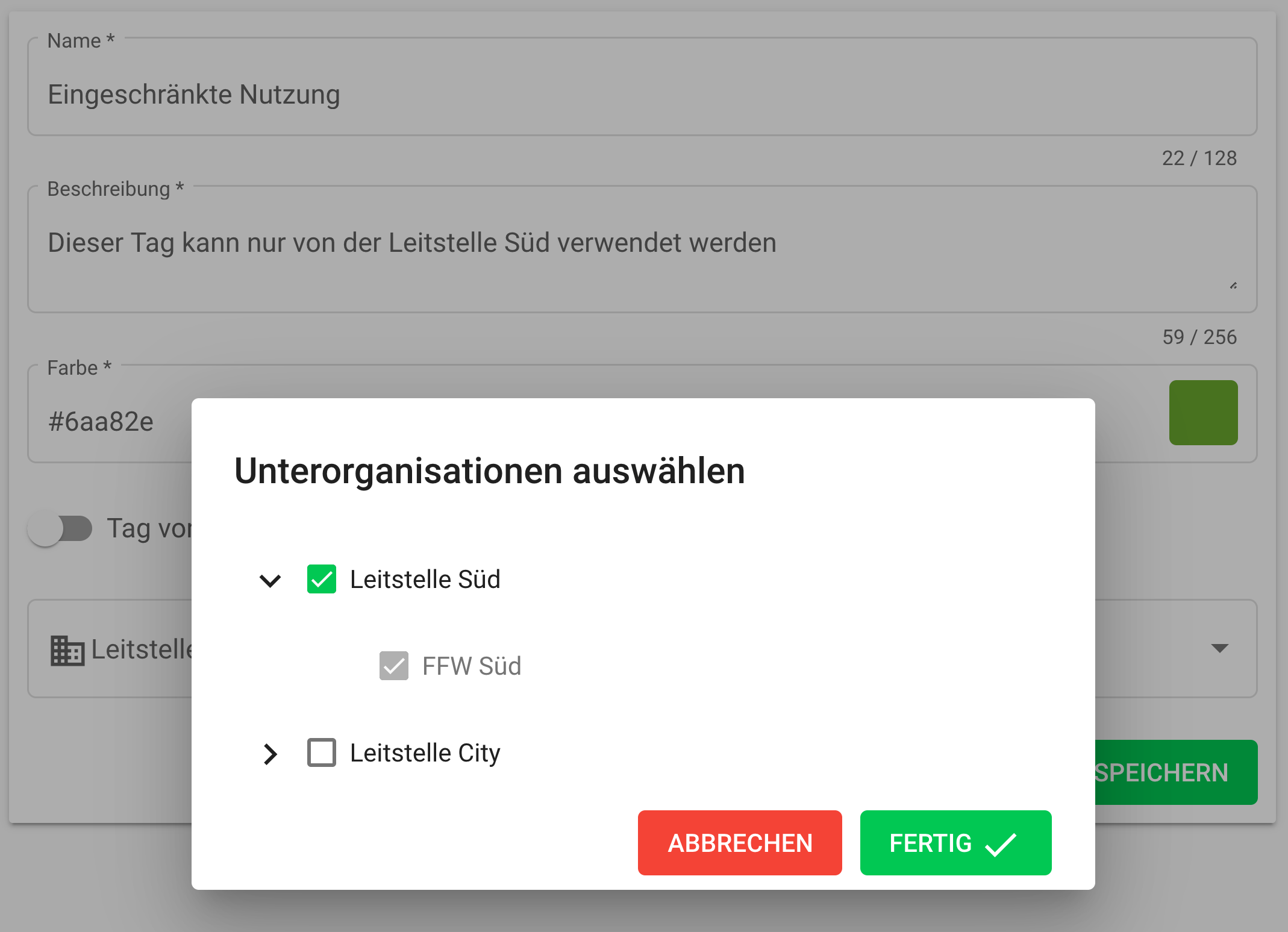 Derzeit waren angelegte Tags der Oberorganisation immer an alle Unterorganisationen freigegeben und konnten verwendet werden. Nun können Sie als Adminstrator der Organisation spezifisch auswählen, welche Unterorganisationen Ihr konfiguriertes Tag sehen und verwenden sollen.