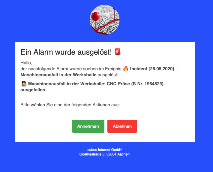 Sollten Sie einen Organisationavatar gesetzt haben, so wird dieser bei organisationsspezifischen E-Mails an der Stelle des GroupAlarm.com-Logos angezeigt. So erhalten die E-Mails Ihrer Organisation einen individuellen Wiedererkennungswert und lassen sich so durch Ihre Teilnehmer einfacher zuordnen.