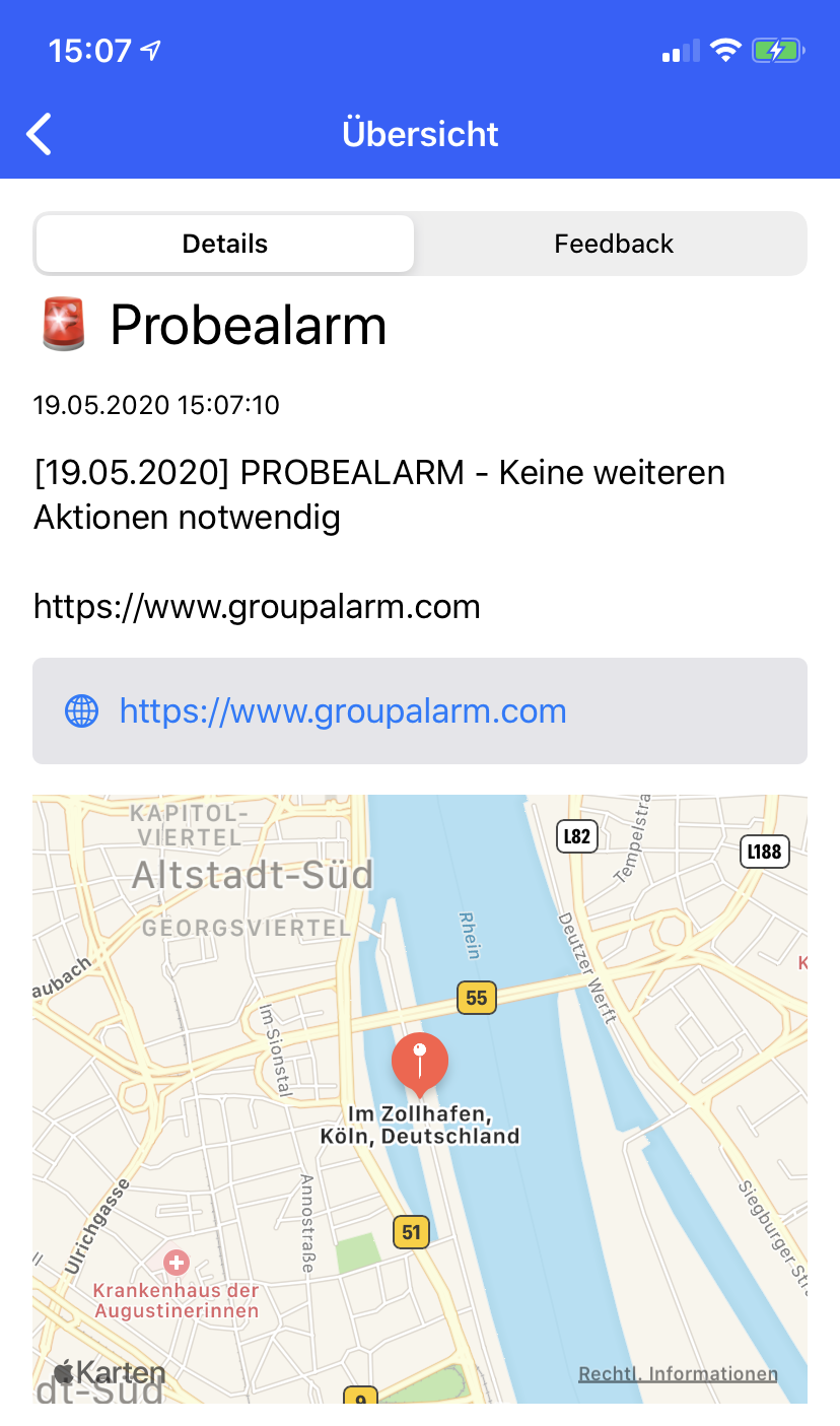 Wenn sich in der Nachricht eines Alarms eine URL zu einer Webseite befinden, so wird diese in der neuen Version der iOS-App als Button angezeigt. So kann der Link direkt im Browser geöffnet werden.