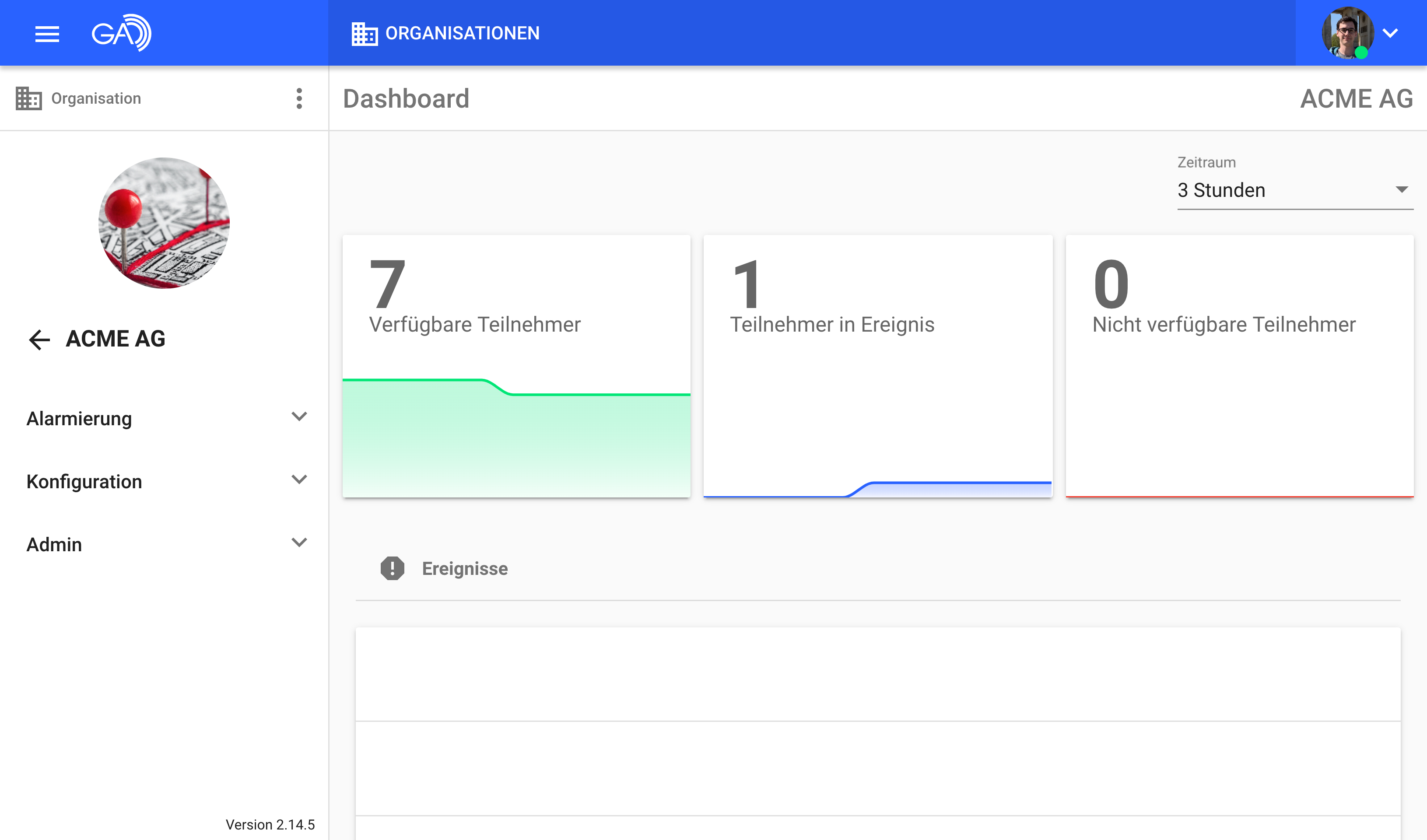 Um einen höhren Wiedererkennungswert Ihrer Organisation innerhalb von GroupAlarm zu erreichen, haben Sie als Administrator nun die Möglichkeit einen eigenen Avatar auszuwählen. Klicken Sie dazu auf die Bildschaltfläche, die sich oberhalb vom Namen der Organisation befindet.