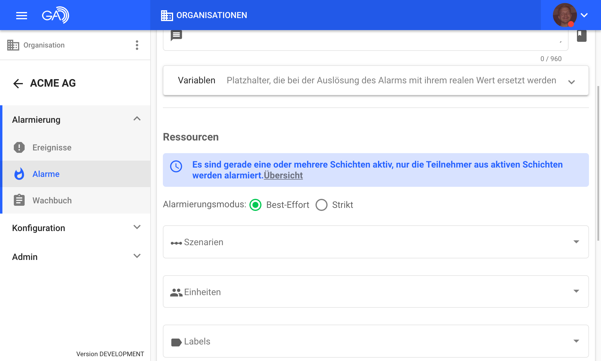 In der Alarmmaske wird nun angezeigt, ob gerade ein Schichtplan aktiv ist. Somit ist für jeden Nutzer direkt ersichtlich, ob für den aktuellen Zeitpunkt ein Schichtplan gilt.