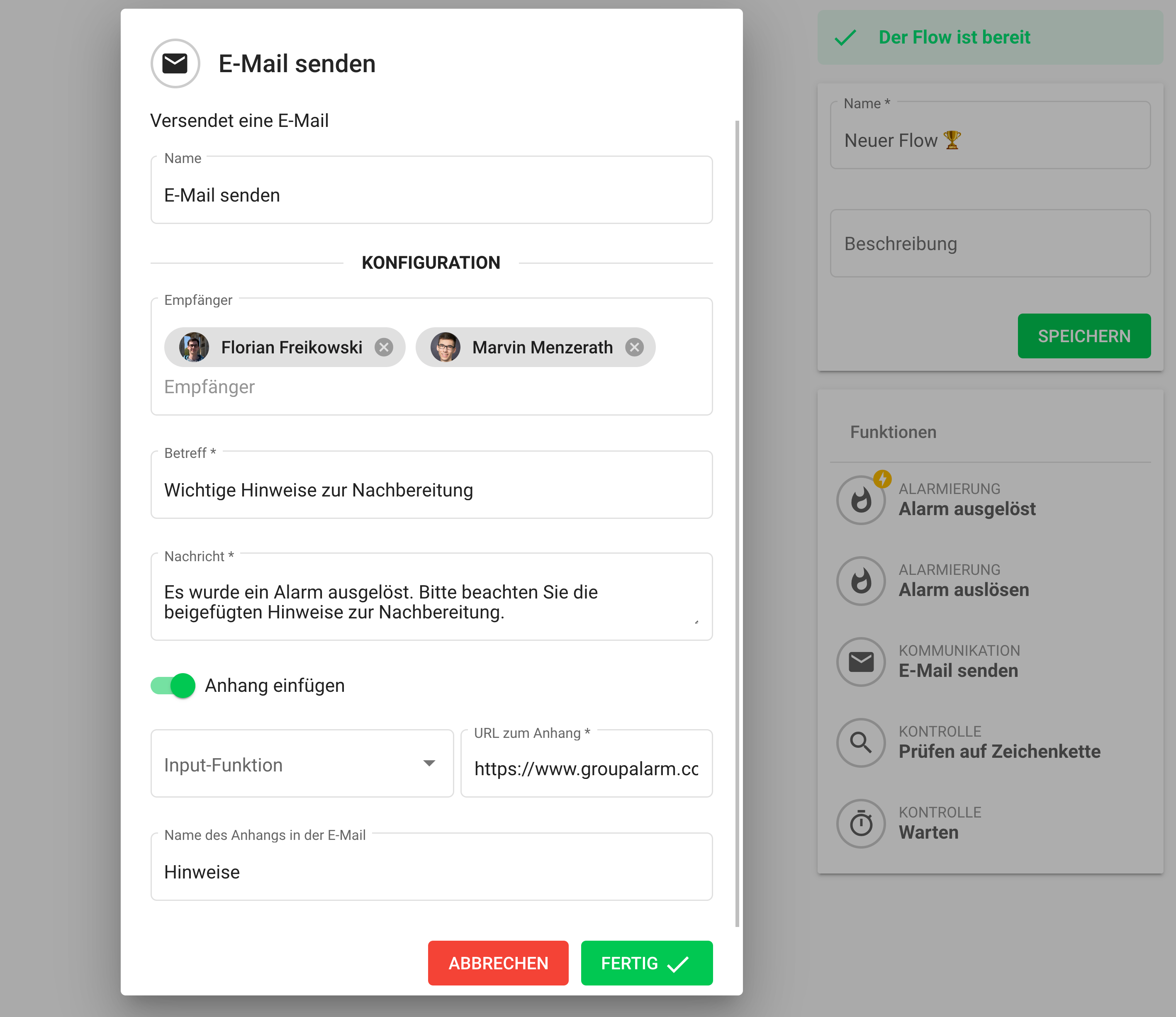 Dem Flow wurde eine weitere Funktion hinzugefügt, die eine E-Mail an die hinterlegten Adressen sendet. Zusätzlich können Betreff und eine eigene Nachricht konfiguriert werden. Zudem kann auch die URL zu einer Datei angegeben werden, die dann der E-Mail als Anhang mitgesendet wird.