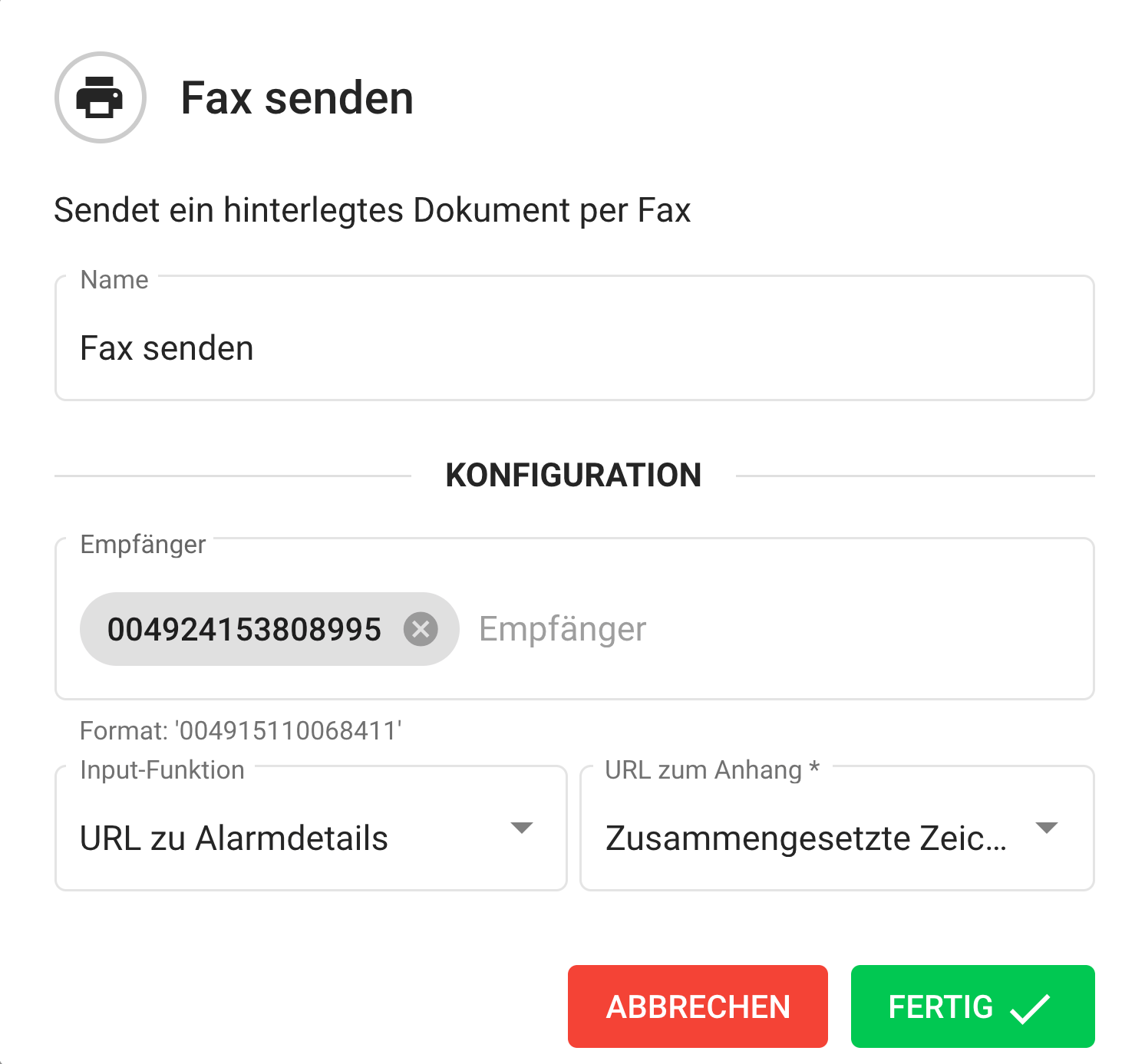 Neben dem E-Mail Versand per Flow können Sie nun auch Telefaxe versenden. So können Sie zum Beispiel die Alarmdetails nach Auslösen eines Alarms per Fax empfangen.