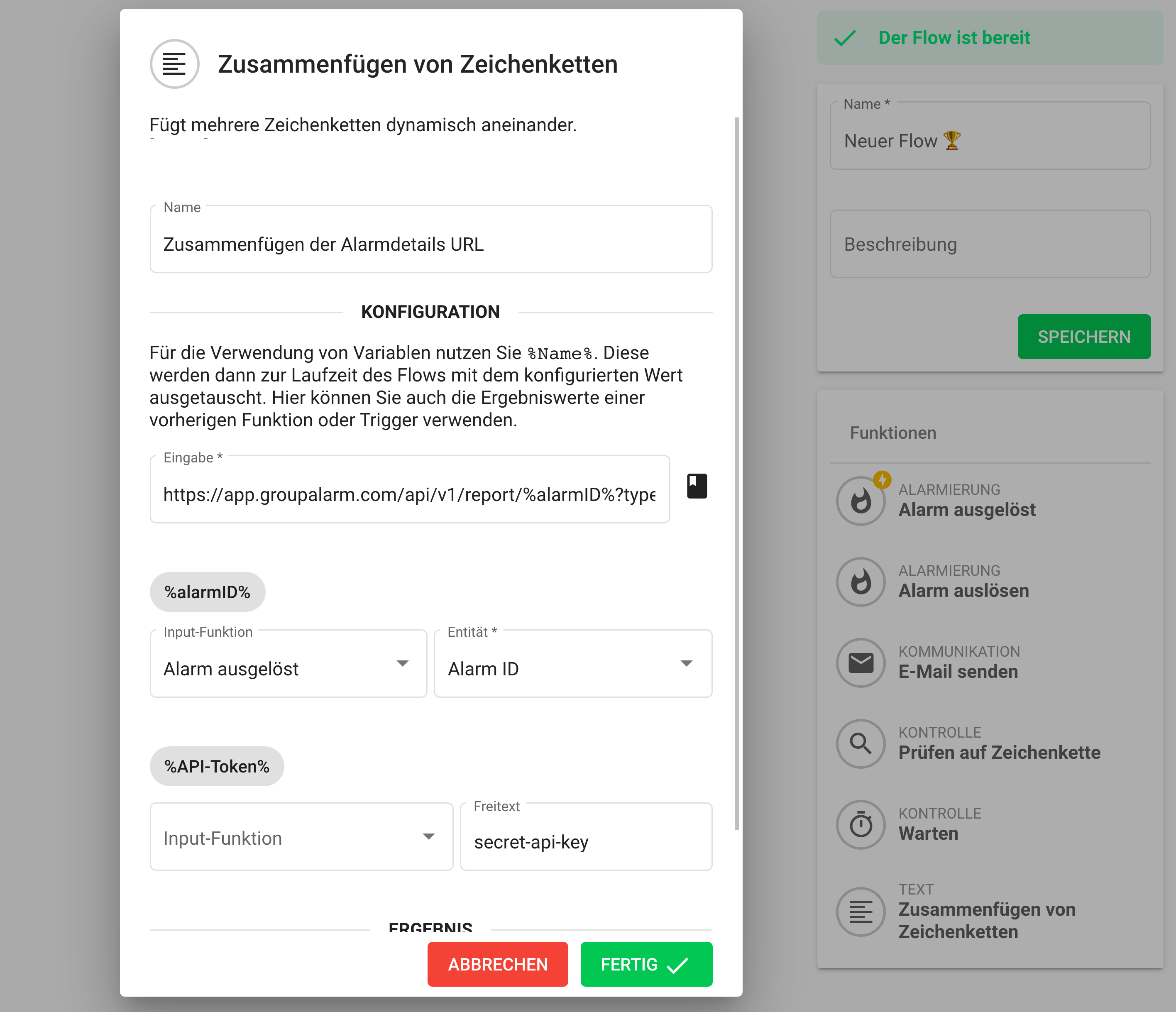 Innerhalb des Flows können Sie nun Zeichenketten zur Laufzeit des Flows zusammensetzen. Nutzen Sie eigene Variablen, um sich zum Beispiel die URL der Alarmdetails im PDF-Format zusammenzubauen – um diese später per E-Mail zu versenden – oder eine neue Alarmnachricht anhand des vorherigen Ereignisnames zu bauen.
