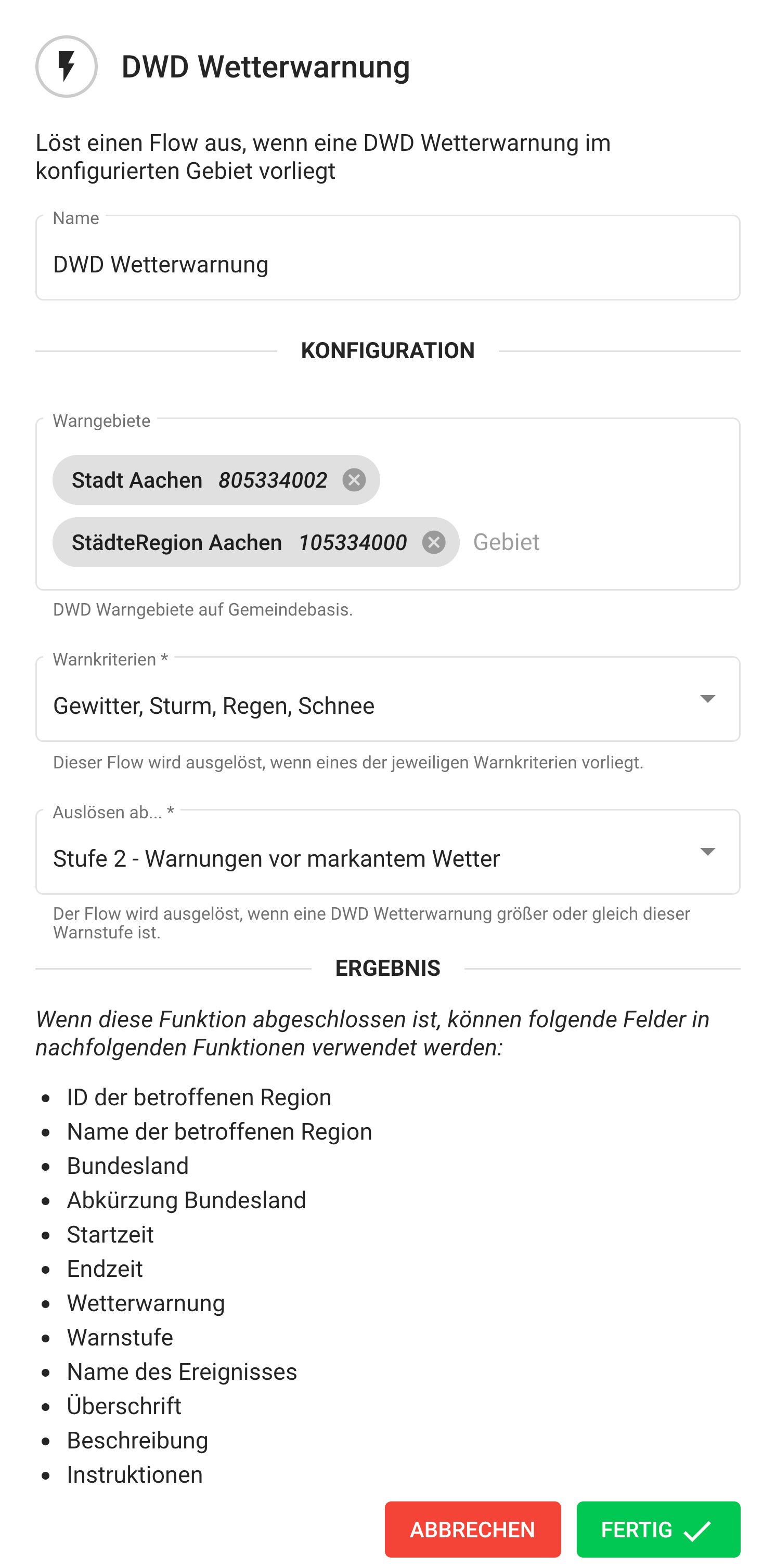 Mit dem neuen Trigger für DWD-Wetterwarnungen können Sie einen Flow bei eingehenden DWD Wetternwarnungen auslösen, wenn diese die von Ihnen konfigurierten Regionen betrifft. Zudem können Sie mehrere Wetterkriterien und die Warnstufe konfigurieren, um eingehende Wetterwarnungen zu filtern.