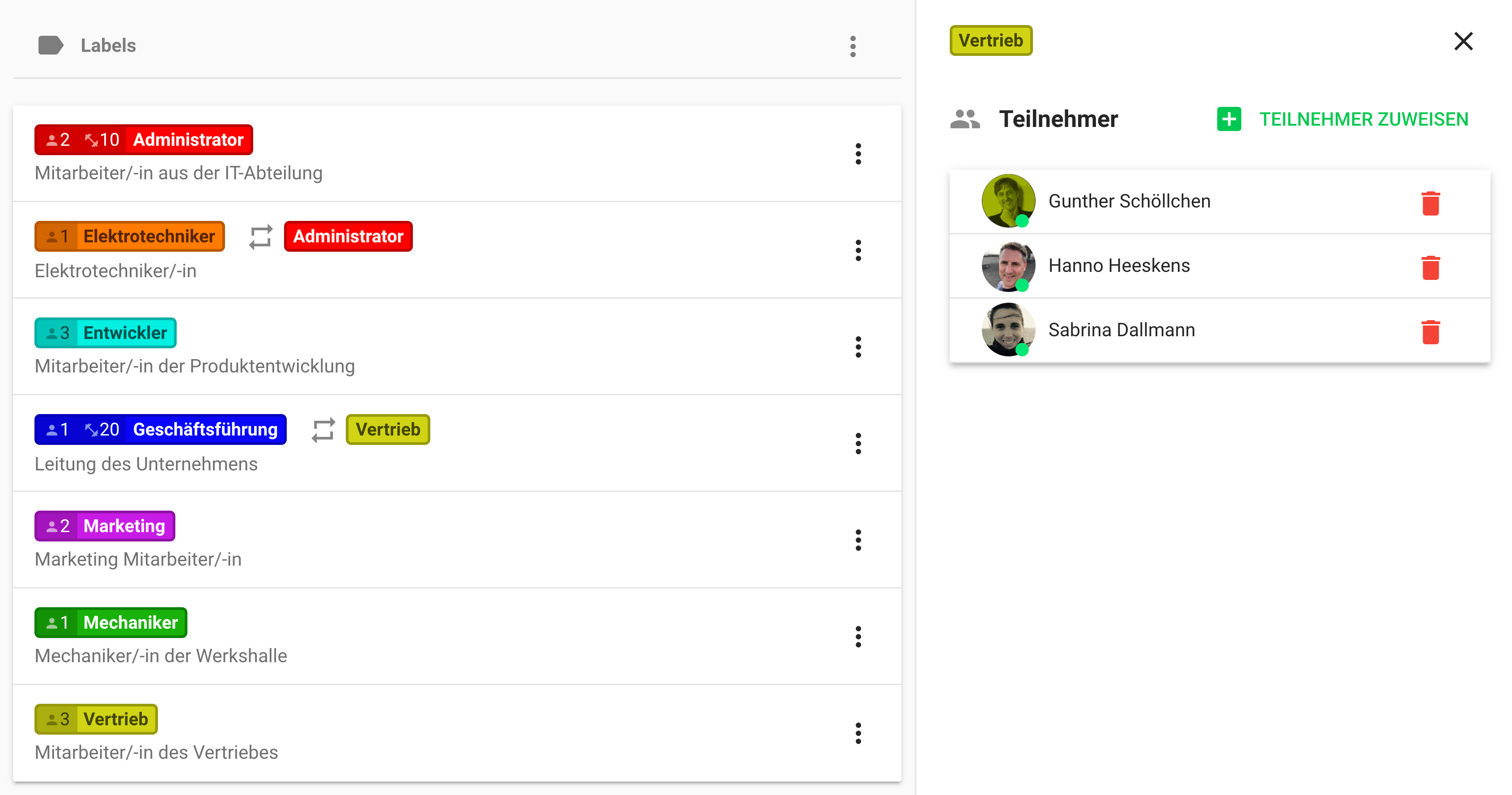 In der Liste der Labels können Sie nun alle zugeordneten Teilnehmer auf einem Blick über die neue Kontext-Option “Teilnehmer” des Labels einsehen. Dabei werden die jeweiligen Teilnehmer rechts tabellarisch neben den Labels angezeigt, sodass Sie komfortabel durch die Liste navigieren können.