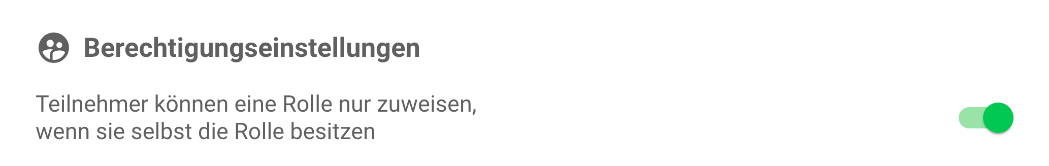 Sollten Sie als Organisationsadministrator nicht wünschen, dass Teilnehmer Rollen vergeben können, die sie selbst nicht inne haben, können Sie dies jetzt in den Organisationseinstellungen unter “Berechtigungseinstellungen” konfigurieren. Wenn diese Option aktiv ist, können Teilnehmer nur noch Rollen an andere Teilnehmer zuweisen, wenn Sie selbst dieser Rolle zugewiesen sind.