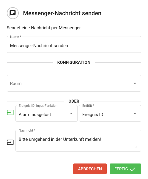 Bisher konnten nur Nachrichten an einen Organisationsraum im Messenger versendet werden. Von nun an können Sie auch an Räume von Ereignissen automatisch eine Nachricht versenden. Dazu benötigen Sie nur die ID des Ereignisses, welche Sie aus vorherigen Funktionen, wie Alarm auslösen oder Ereignis suchen, erhalten.