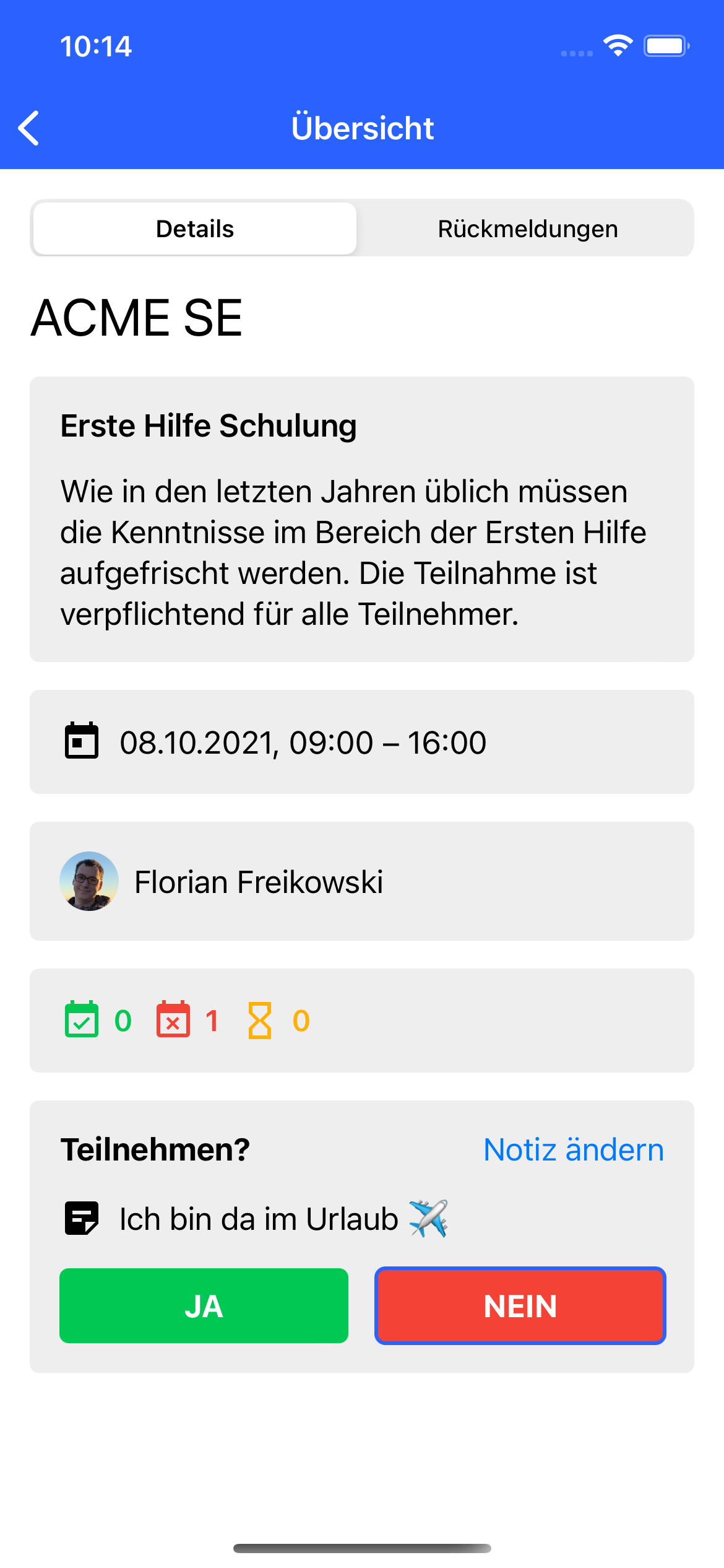 Neben dem Hinterlegen einer Notiz, können Sie natürlich auch die gespeicherten Rückmeldungen der anderen Teilnehmer in in einem Termin einsehen. Innerhalb der mobilen Apps können Sie dazu den Rückmeldungen-Tab eines Termins verwenden.