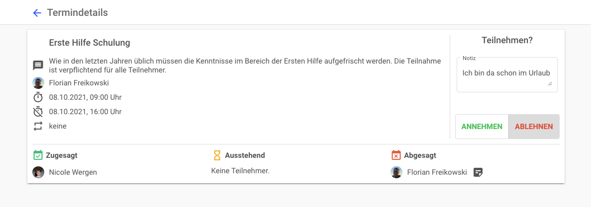 Mit den neuen Updates innerhalb der Web-App und den mobilen Apps können Sie nun bei der Rückmeldung auf einen Termin auch eine eigene Notiz hinterlegen. So können Sie zum Beispiel bei einer Absage den Grund nennen, um so die Übersicht über den Termin für den Organisator zu erleichtern.