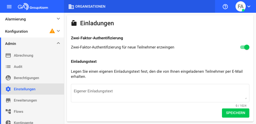 Für Kunden mit erhöhtem Schutzbedarf steht ab sofort das Erzwingen der Zwei-Faktor-Authentifizierung bereit. Die optionale Einstellung finden Sie in den Organisationseinstellungen im Reiter Einladungen. Dadurch werden neu eingeladene Teilnehmer dazu aufgefordert ihren Zugang mit einer Zwei-Faktor-Authentifizierung zu sichern. Erst danach können sie Ihrer Organisation erfolgreich beitreten.