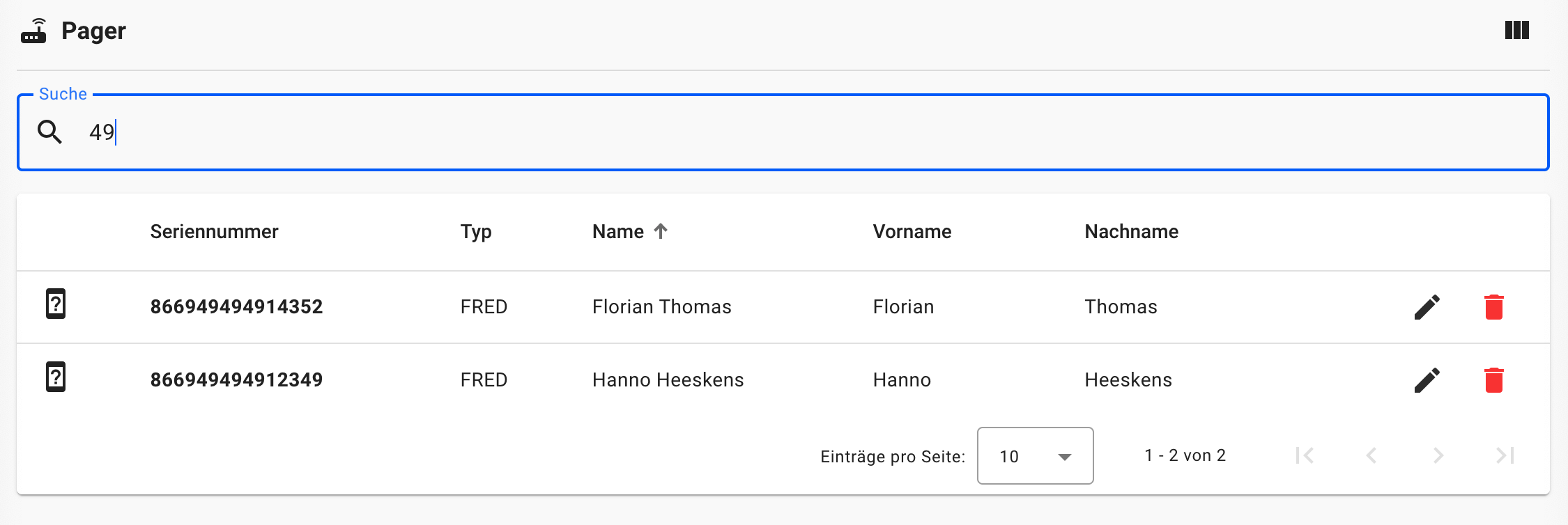 Die Tabelle in der Pagerverwaltung erlaubt nun die Suche nach Pagernummer, Name und Teilnehmer sowie die Sortierung nach diesen Kriterien und dem Pagerstatus.