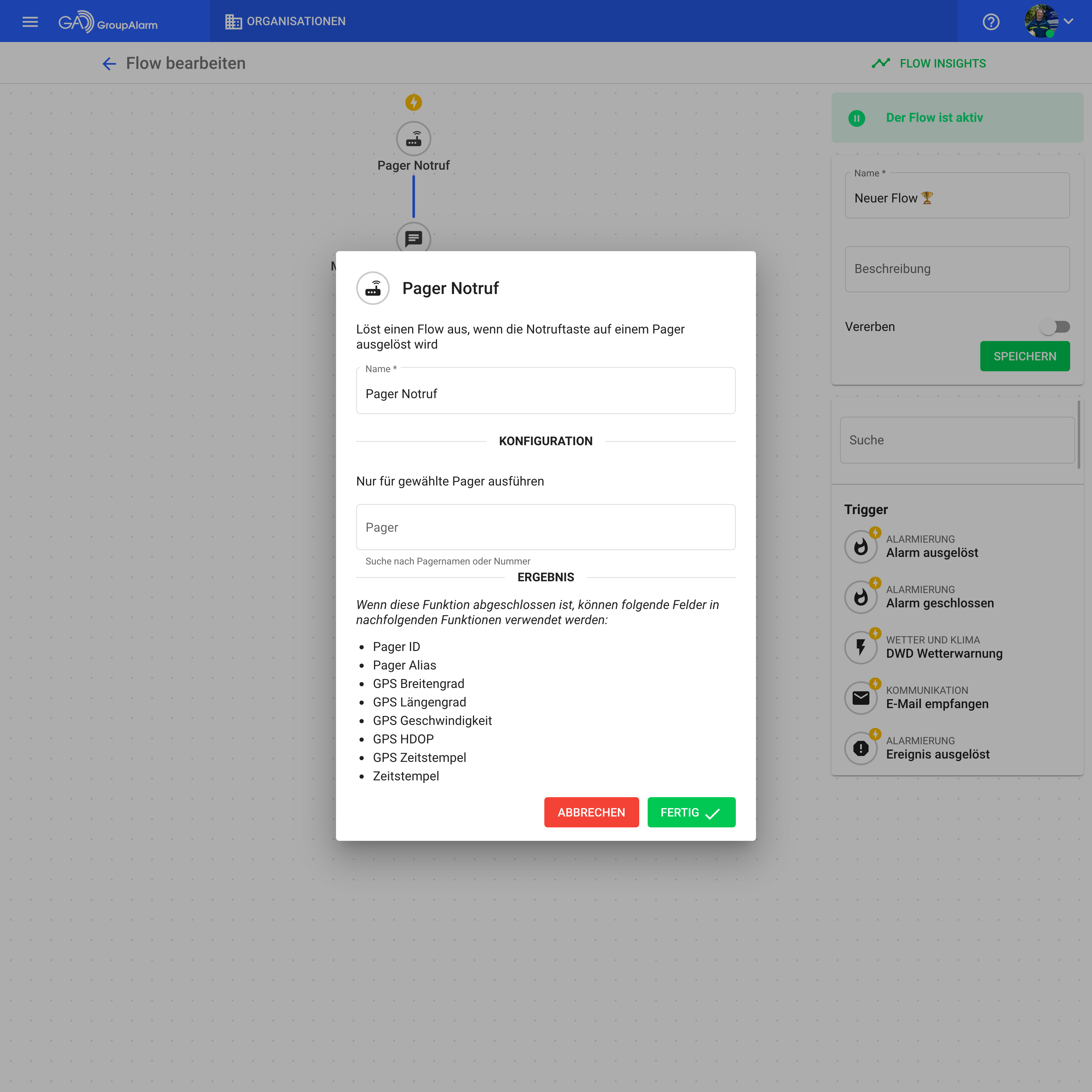 Der Flow wurde um zwei Trigger ergänzt, die auf die Totmannschaltung und die Notruftaste des IoT-F.R.E.D. Pagers reagieren. Am Pager können beide Funktionen aktiviert und konfiguriert werden. Beim Alleinarbeiter-Schutz wird ein Alarm ausgelöst, wenn ein regelmäßiger Totmann-Ton nicht quittiert wird. Die Notruffunktion wird hingegen willensabhängig per Knopfdruck ausgelöst.