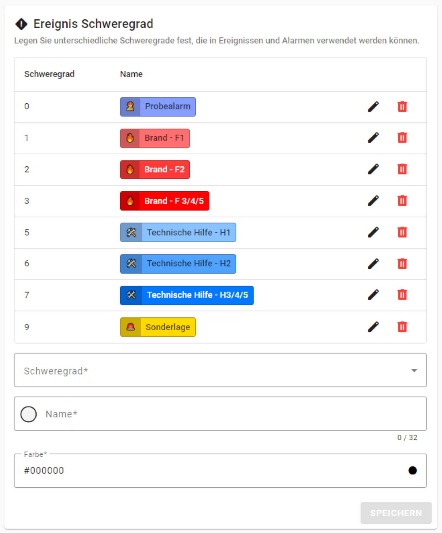Ab sofort haben Sie in den Organisationseinstellungen die Möglichkeit, bis zu zehn verschiedene Schweregrade / Typen für Ereignisse und den darin befindlichen Alarmen zu definieren. Jeder Schweregrad besteht dabei aus einem Namen, einem beschreibenden Icon sowie einer Farbe. Damit ist sichergestellt, dass Sie möglichst flexibel sind und bei Verwendung sofort erkennen können, welche Kritikalität vorliegt. Sie können neben den klassischen Schweregraden wie “Information” - “Warnung” - “kritisch” - “sehr kritisch” auch spezifische Kategorien für Ereignisse festlegen, wie beispielsweise „Brand“, “Hilfeleistung” oder „Technische Hilfe“. Auch Kombinationen sind möglich, wenn Sie z.B. das Stichwort Brand weiter definieren von Entstehungsbrand bis Großbrand. Sobald die Schweregrade definiert sind, stehen sie bei der Alarmauslösung im Web, in den Alarmvorlagen und im Flow für alle Alarm- und Ereignis-Funktionen zur Verfügung. Zudem können die Schweregrade über die REST-API gesetzt werden. Im Web werden die definierten Schweregrade bei allen Ereignissen und Alarmen sowie in den PDF-Reports angezeigt. In den Apps können Teilnehmer individuell je Organisation und Schweregrad unterschiedliche Einstellungen für die Signalisierung vornehmen, beispielsweise durch die Auswahl verschiedener Alarmtöne. So können einfache Warnungen und kritische Hinweise, kleine Brände oder Großschadenslagen direkt bei der Alarmierung unterschiedlich signalisiert werden. Die Schweregrade stehen allen Organisationen ohne weitere Kosten direkt zur Verfügung.