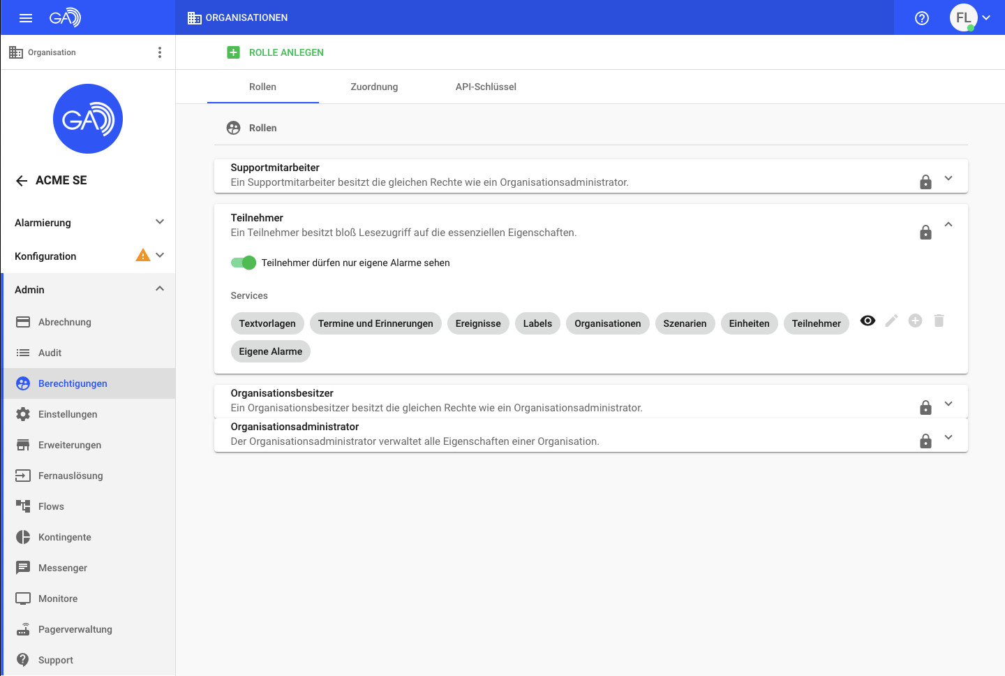Innerhalb der Berechtigungen können Sie genau dieses Verhalten konfigurieren. Navigieren Sie dazu innerhalb Ihrer Organisation unter Admin -> Berechtigungen zu Ihrer Teilnehmer-Roller und klappen diese auf. Deaktivieren Sie nun die Option Teilnehmer dürfen nur eigene Alarm sehen. In der Services Liste wird nun automatisch der Punkt Alarme entfernt und der Punkt Eigene Alarme verbleibt.