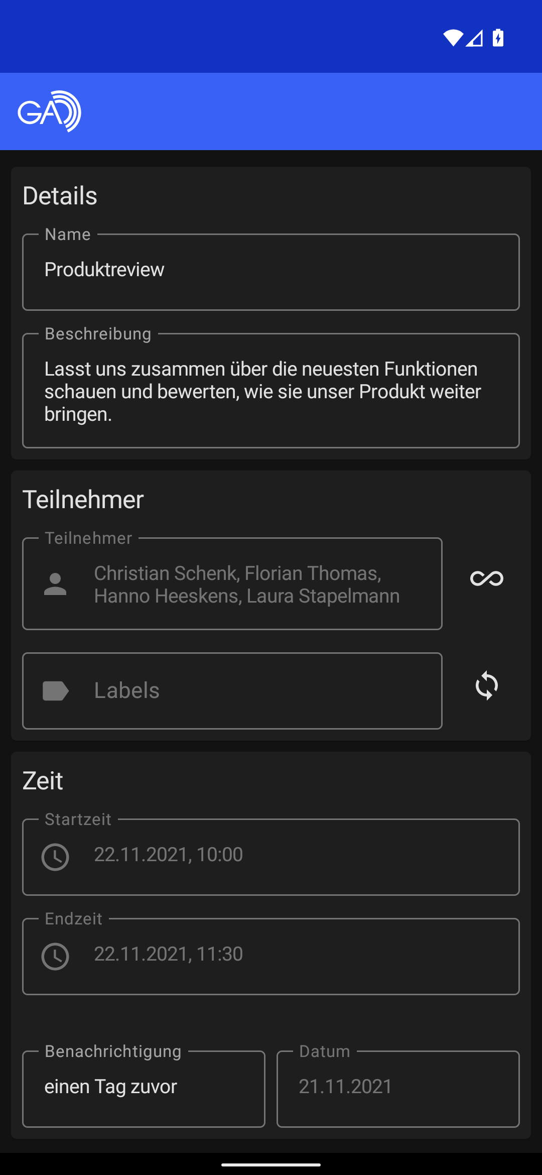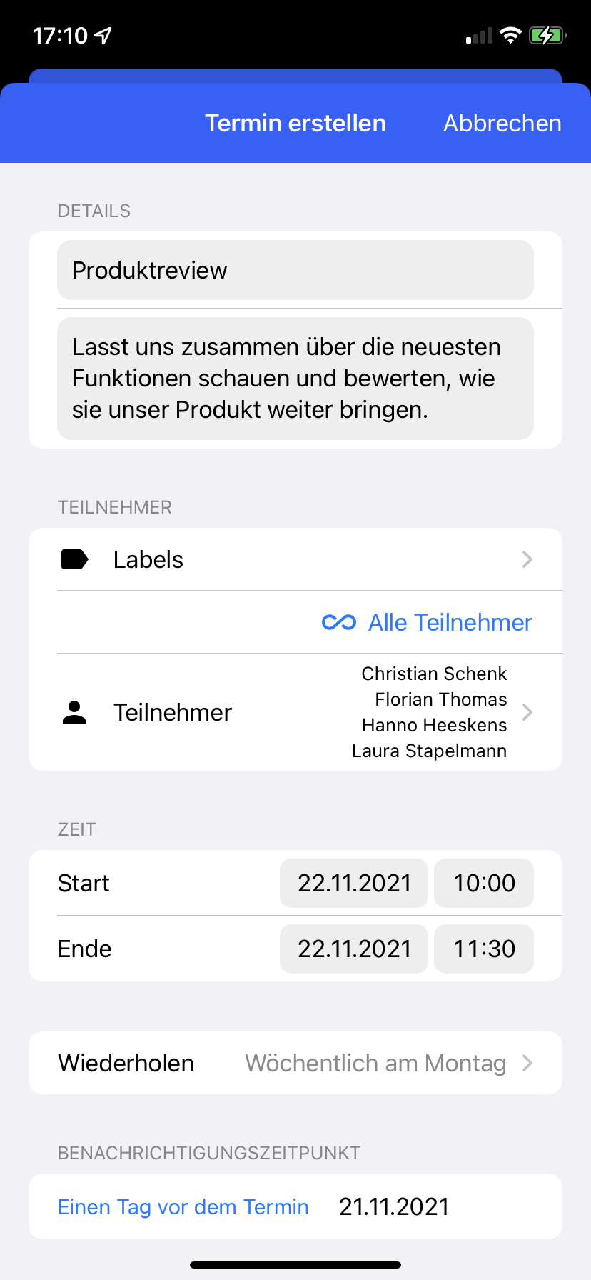 Dort haben Sie die Wahl aus allen bekannten Optionen aus der Web-App. So können Sie neben einem Namen, Beschreibung Start- und Endzeitpunkt auch eine mögliche Wiederholung konfigurieren. Zusätzlich kann der Benachrichtigungszeitpunkt verändert werden, sodass Ihre Teilnehmer erst zu einer bestimmten Zeit über den anstehenden Termin benachrichtigt werden.
