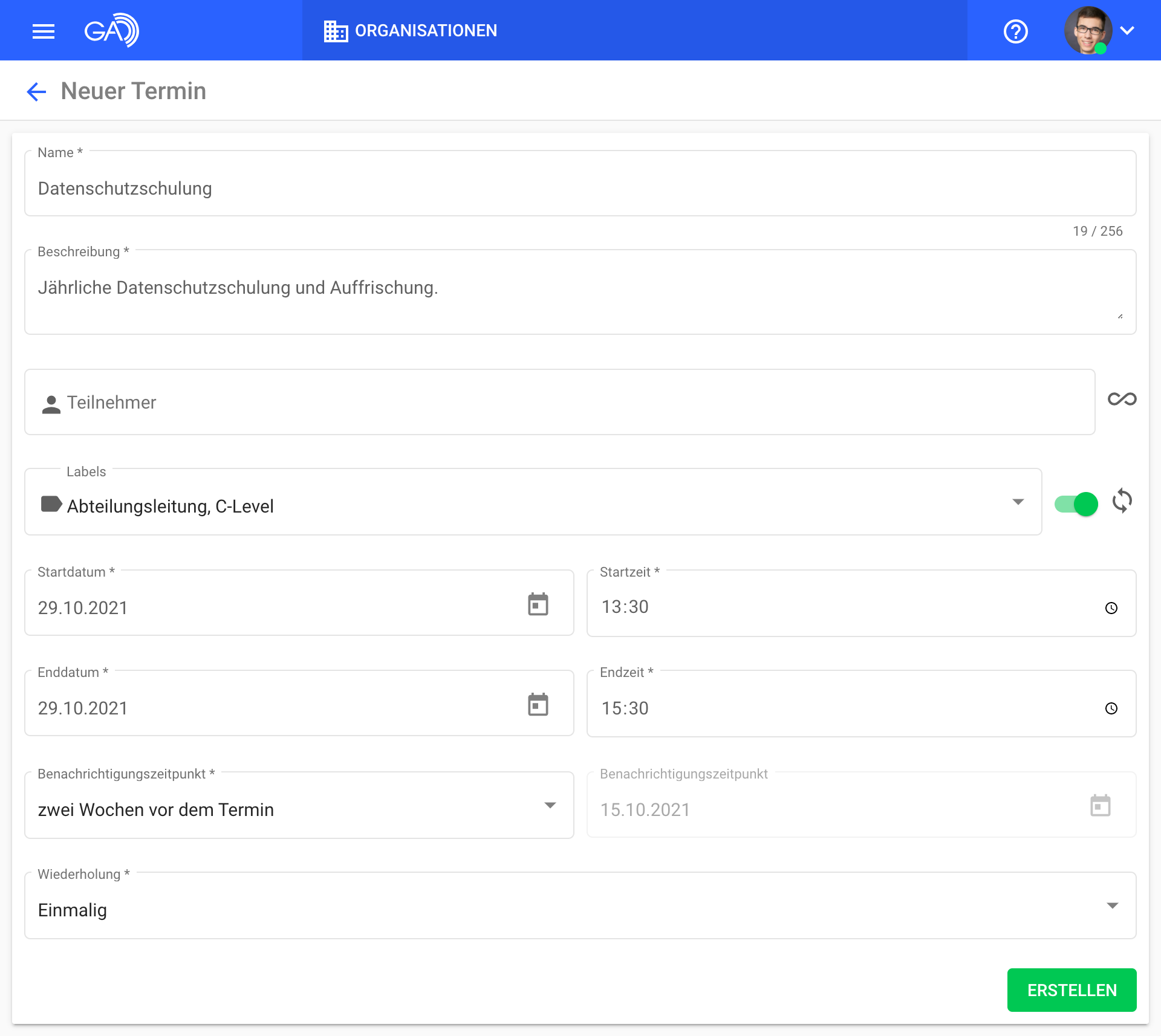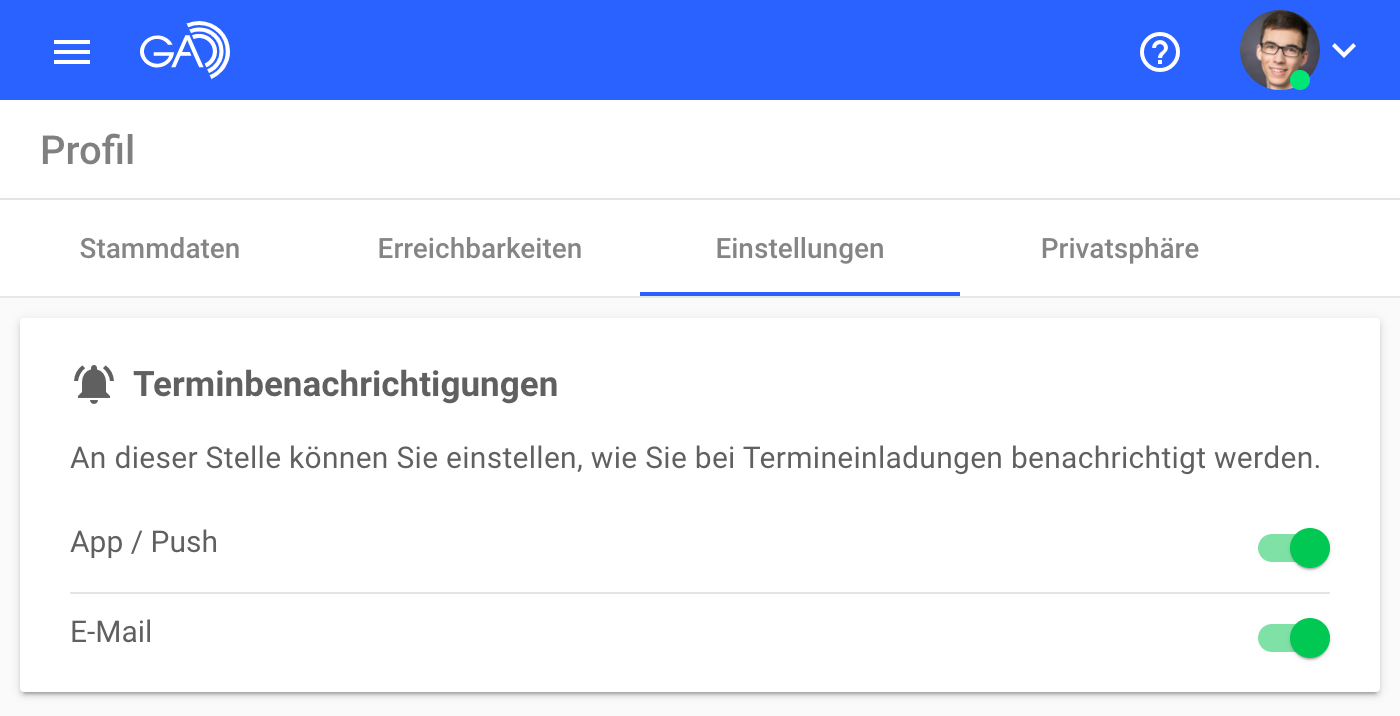 Zudem können Teilnehmer nun im Profil unter Einstellungen auswählen, über welchen Weg sie zu Terminen eingeladen werden möchten. Standardmäßig sind beide Benachrichtigungswege aktiv.