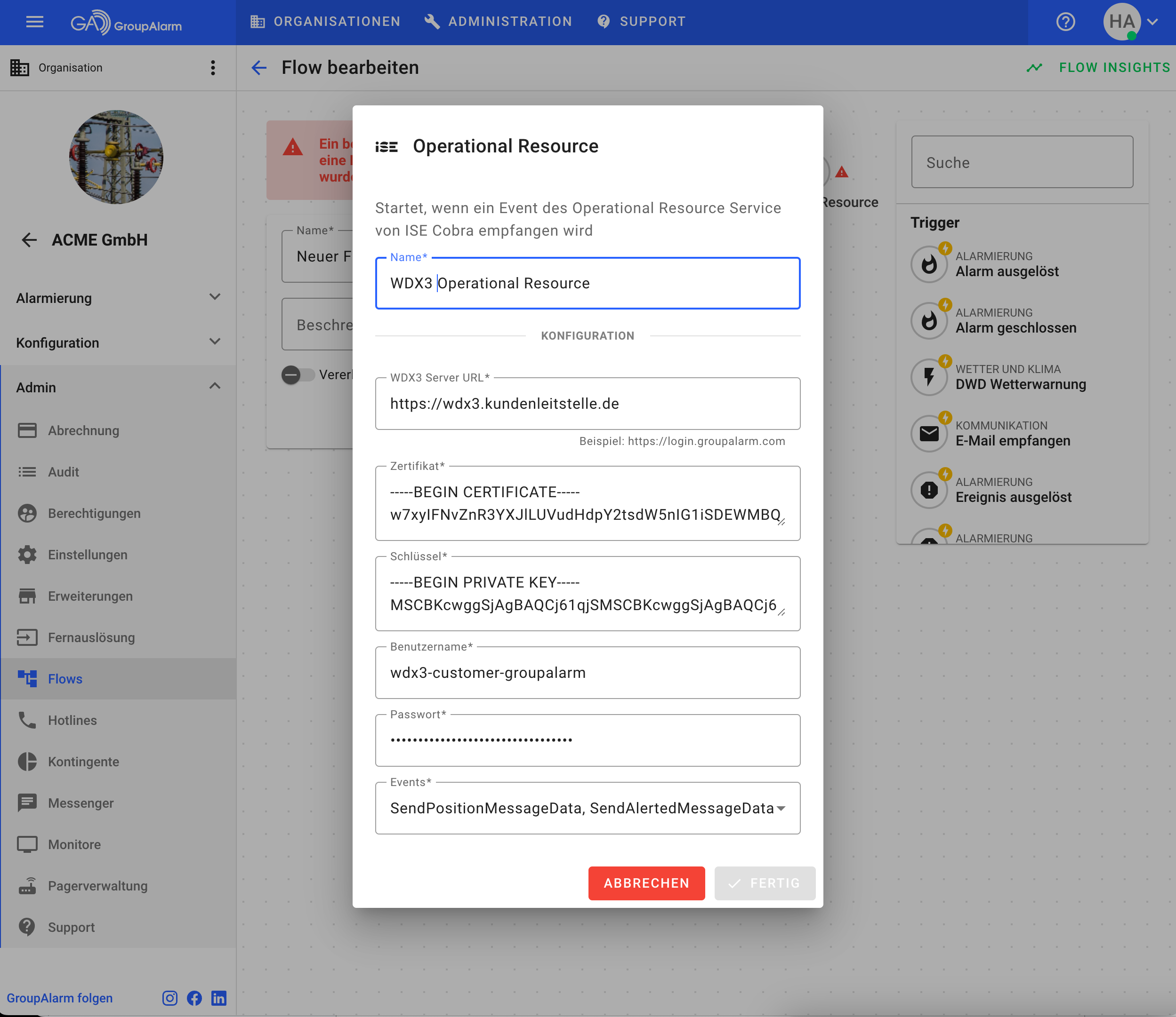 Ab sofort kann das iSE-COBRA Einsatzleitsystem auch per WDX3 Schnittstelle an GroupAlarm angebunden werden. Diese Verbindung ermöglicht den standardisierten Datenaustausch zwischen den Systemen. Nach der Einrichtung übermittelt das ELS alle Einsatzdaten sowie die verwendeten Ressourcen an GroupAlarm. Dort kann abhängig von den Daten entschieden werden, welche Aktion ausgeführt werden soll, sei es z. B. die Eröffnung oder der Abschluss eines Ereignisses oder der Statuswechsel eines Fahrzeugs. Dafür stehen in den Flows für alle Kunden neue Trigger bereit, die die Daten der WDX-3 Schnittstelle annehmen und verarbeiten können.