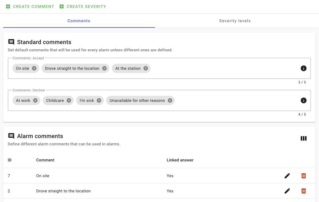 Sometimes a simple yes or no answer to an alarm is not precise enough. From now on, when triggering an alarm, you have the option of defining various comments as additional information after the YES/NO response. These comments can be selected by your alarm recipients via app and/or email. You can view the results via app, monitor, web view, and report.