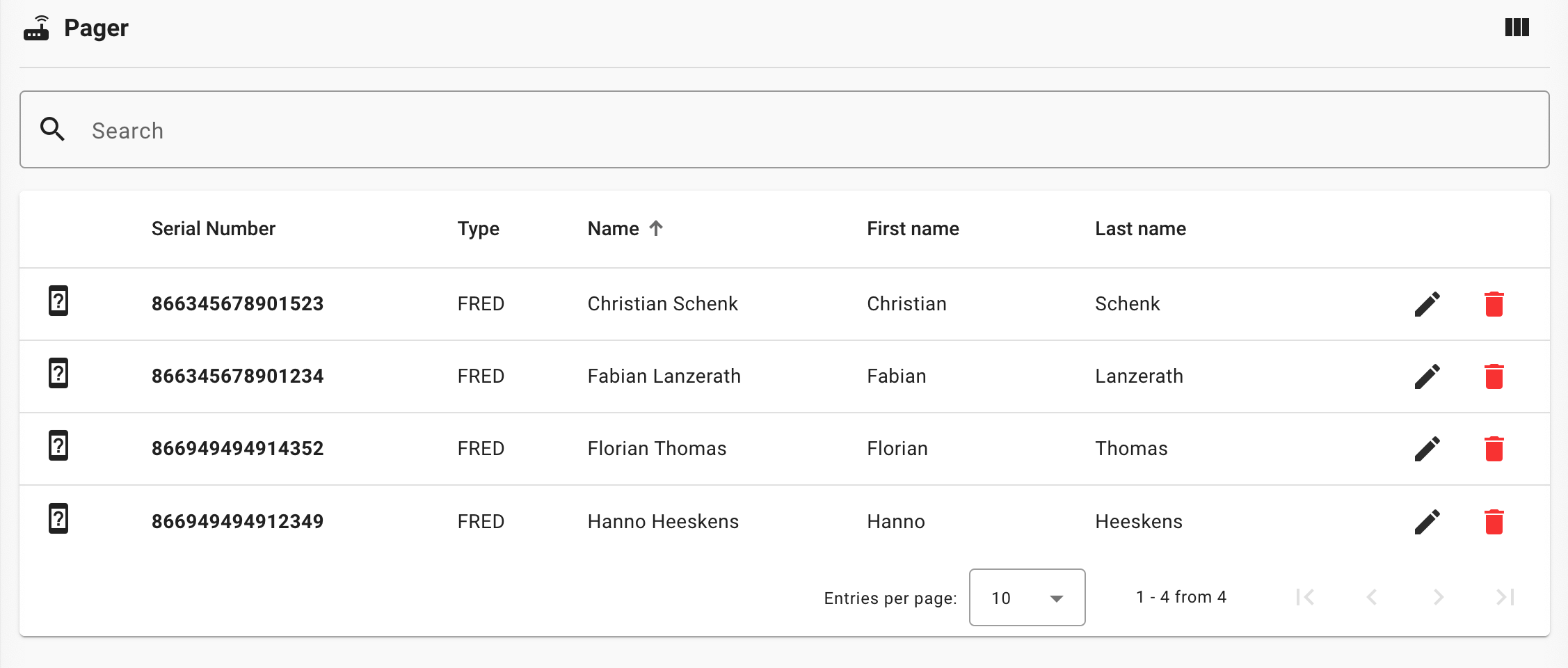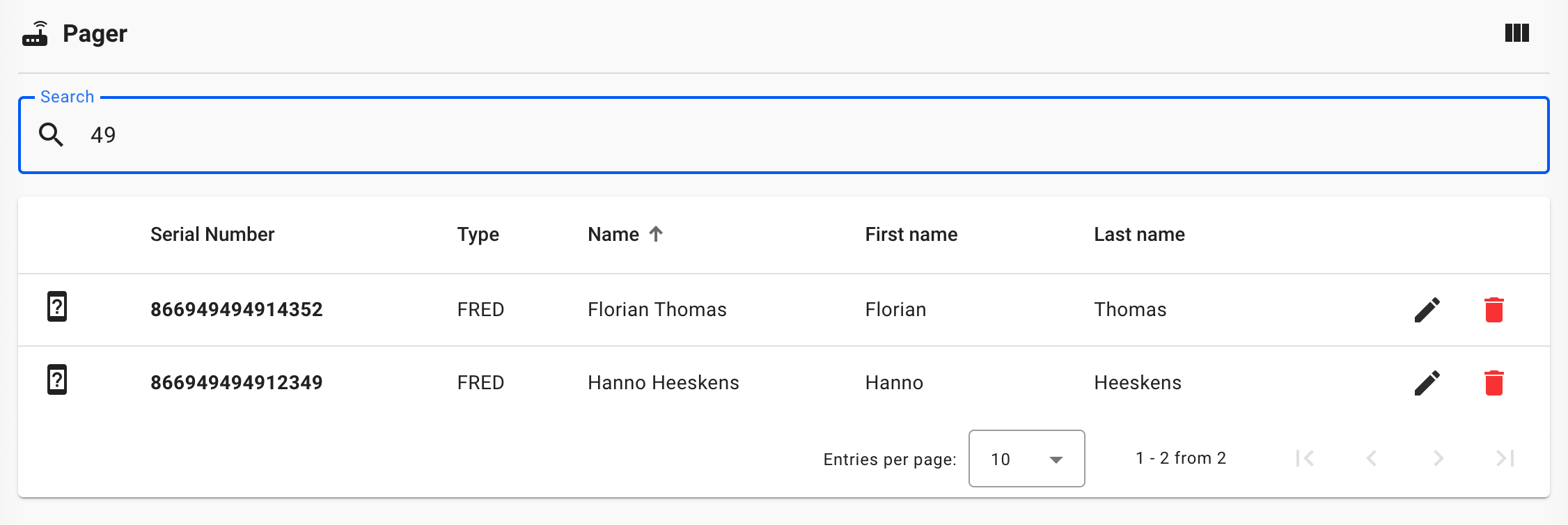 The table in the pager administration now allows searching by pager number, name and participant as well as sorting by these criteria and the pager status.